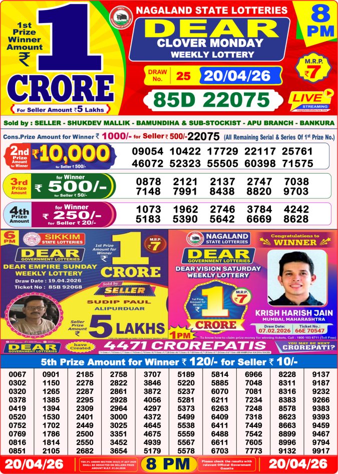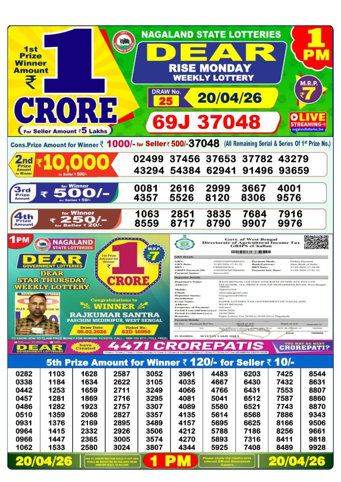 Nagaland State Dear Lottery Result 1PM Dated [20-04-2026]