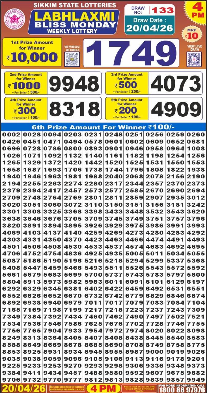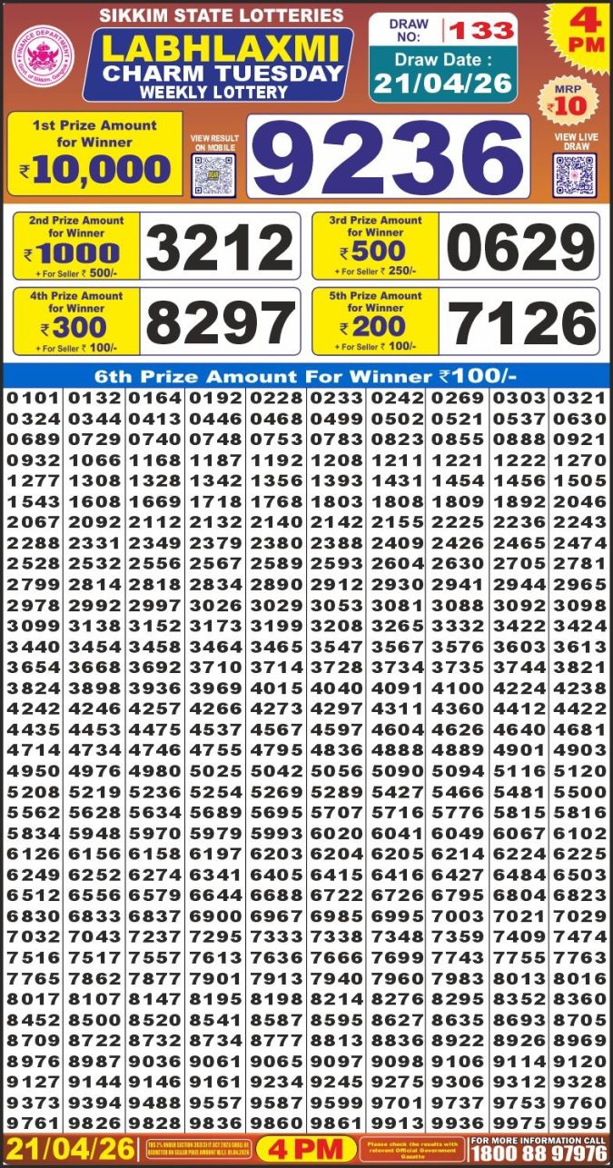 Sikkim State Labh Laxmi Lottery Result Today 4PM [20-04-2026]