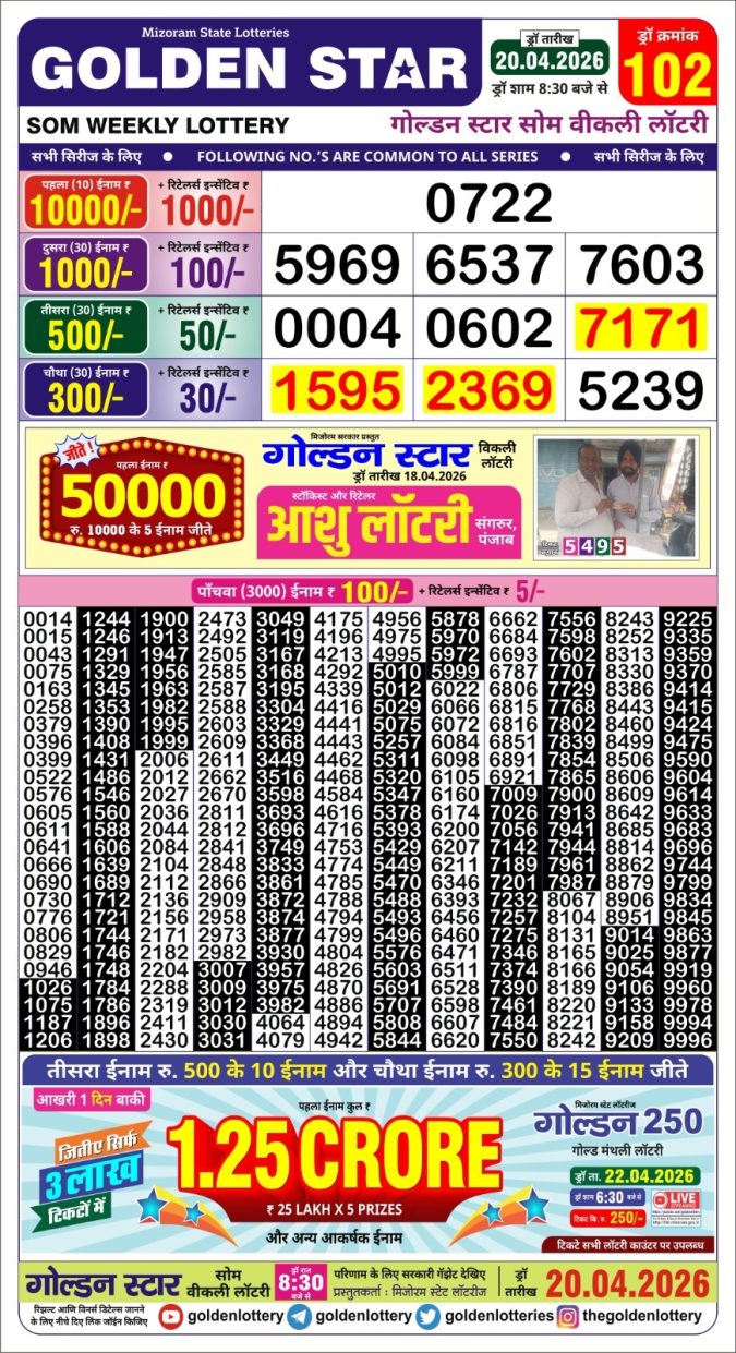 Golden Star Lottery Result 8:30PM Dated [20-04-2026]