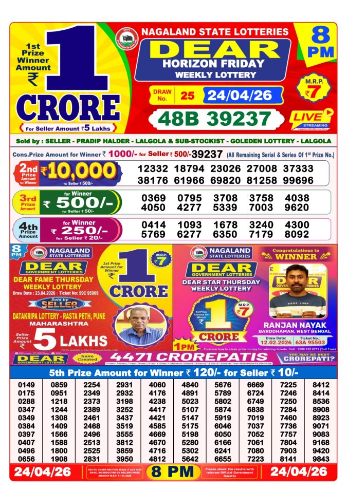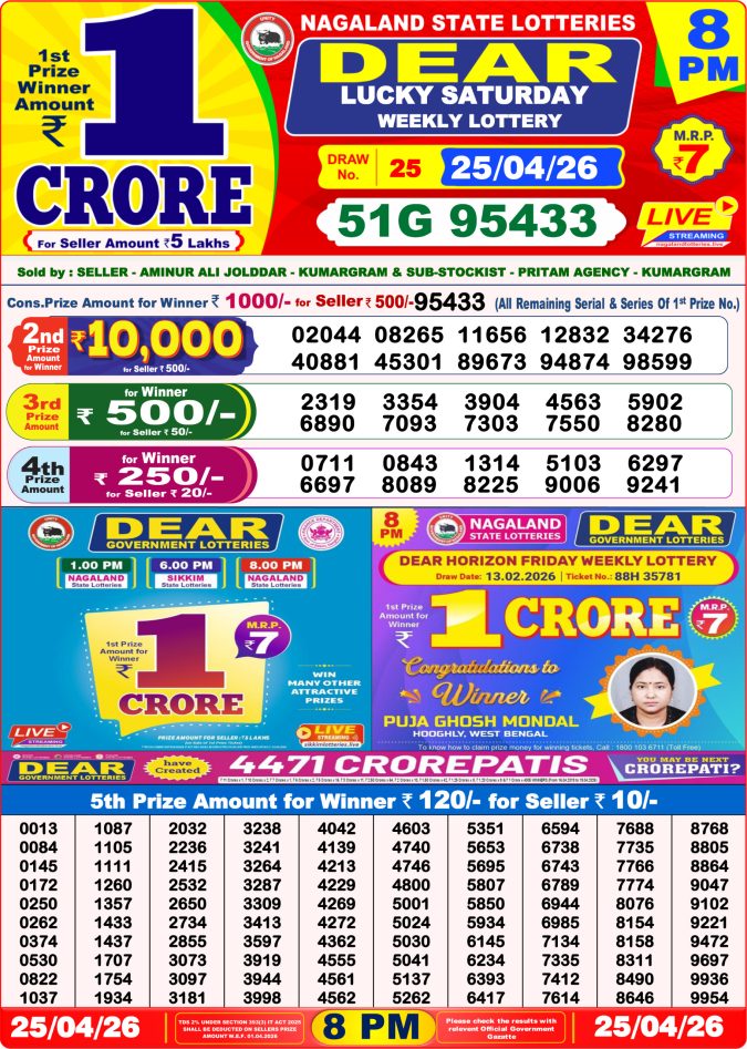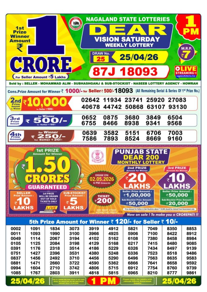 Nagaland State Dear Lottery Result 1PM Dated [25-04-2026]