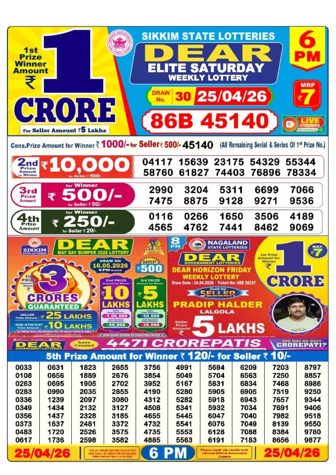 Sikkim State Dear Lottery 6PM Result Dated [25-04-2026]