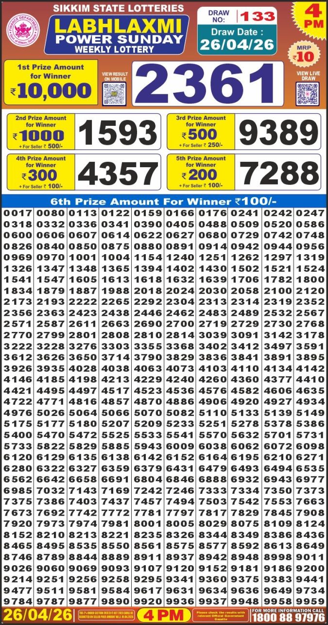 Sikkim State Labh Laxmi Lottery Result Today 4PM [25-04-2026]