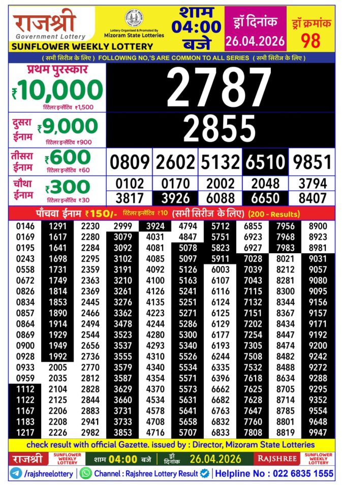 Mizoram Rajshree Lottery Result 4PM [25-04-2026]