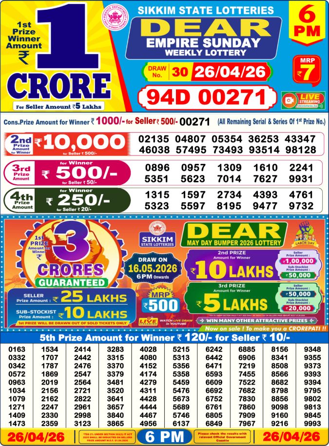Sikkim State Dear Lottery 6PM Result Dated [26-04-2026]