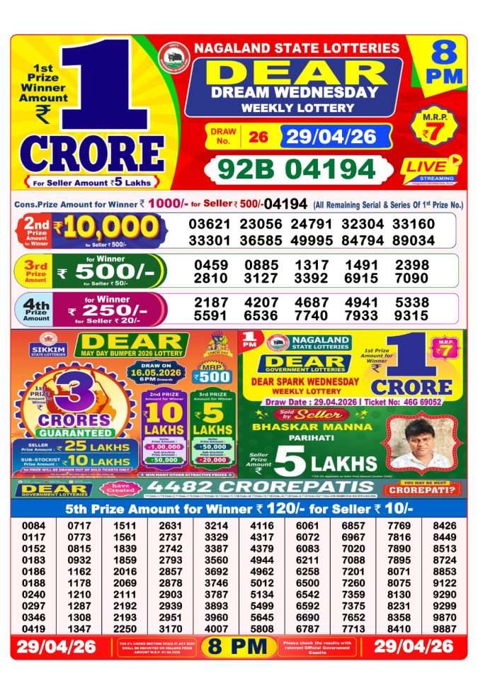 Nagaland State Dear Lottery Result 1PM Dated [29-04-2026]