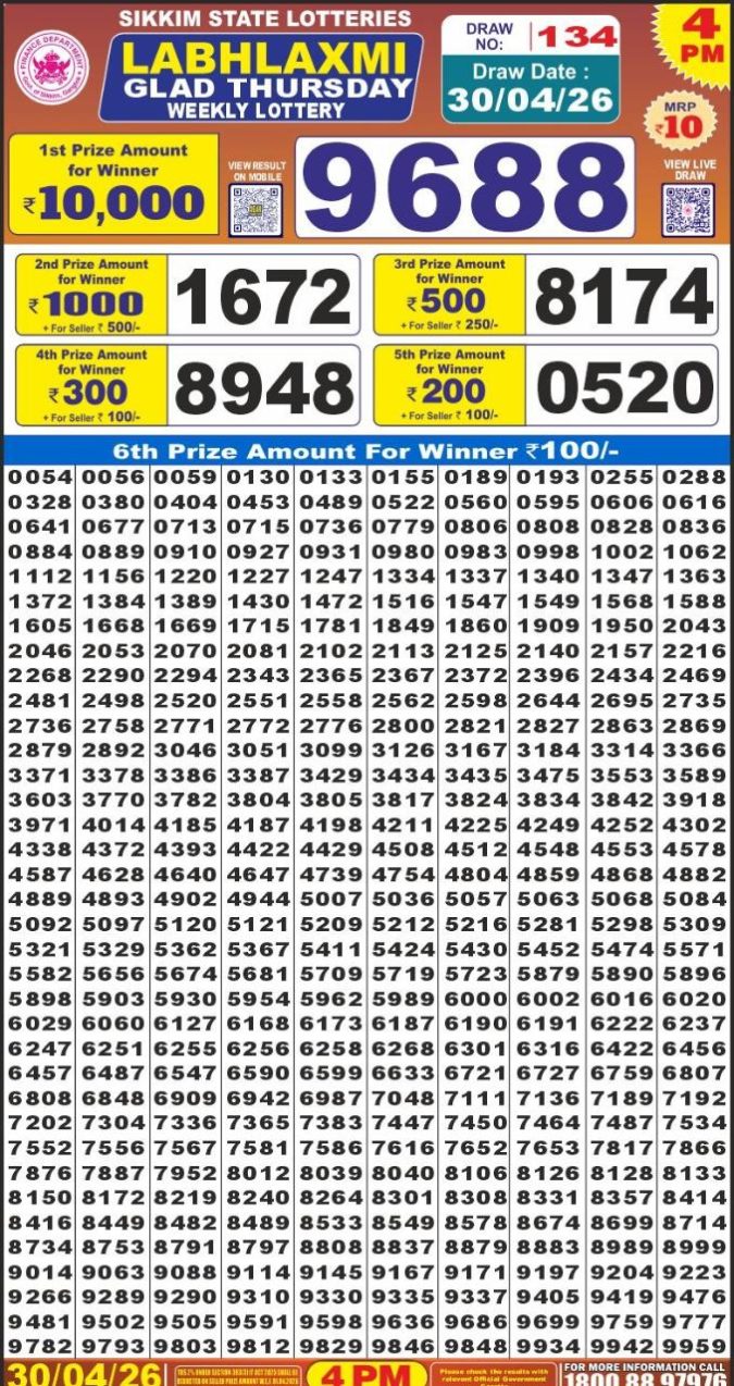 Sikkim State Labh Laxmi Lottery Result Today 4PM [29-04-2026]