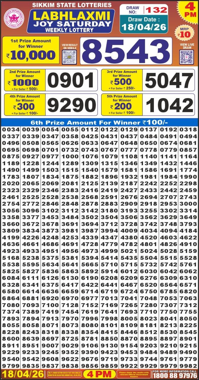 Sikkim State Dear Lottery 6PM Result Dated [18-04-2026]