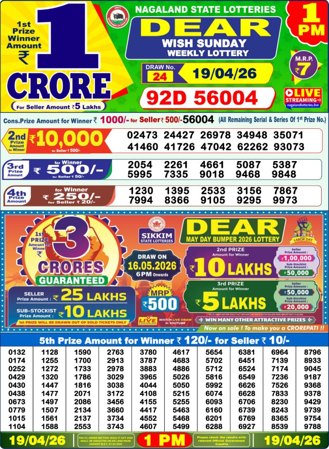 Nagaland State Dear Lottery Result 1PM Dated [19-04-2026]