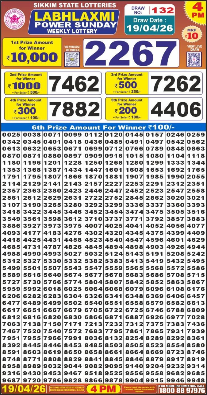 Sikkim State Labh Laxmi Lottery Result Today 4PM [19-04-2026]