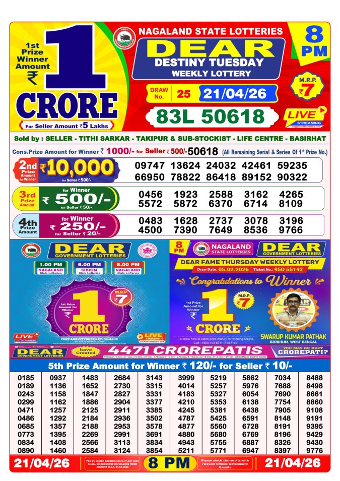 Nagaland State Dear Lottery Result 1PM Dated [21-04-2026]
