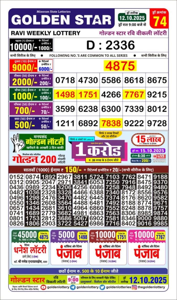 Golden Star Lottery Result Today 9 PM (12-10-2025)