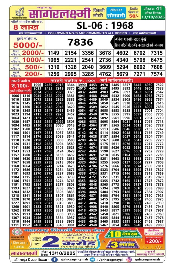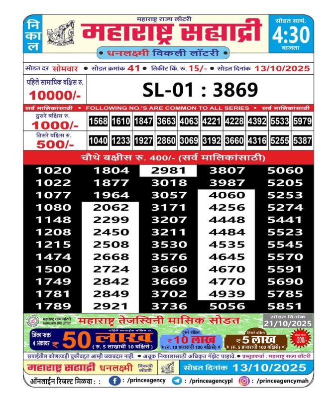 Maharashtra Sahyadri Lottery Result Today 4.30 PM (13-10-2025)