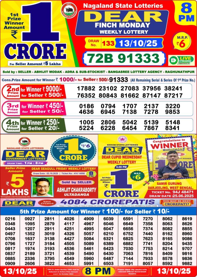Nagaland Dear Lottery Result Today 1 PM (13-10-2025)