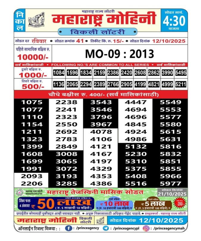 Maharashtra Mohini Lottery Result Today 4.30 PM (12-10-2025)