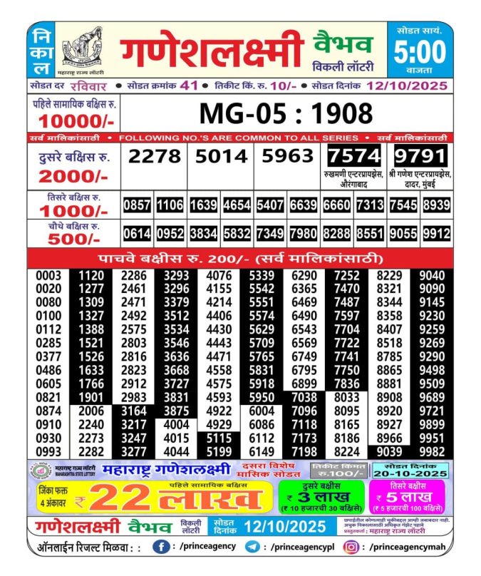 Maharashtra Ganeshlaxmi Lottery Result Today 5 PM (12-10-2025)