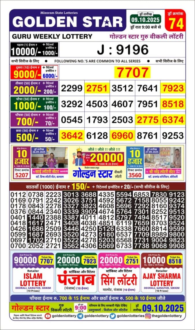 Golden Star Lottery Result Today 9 PM (09-10-2025)