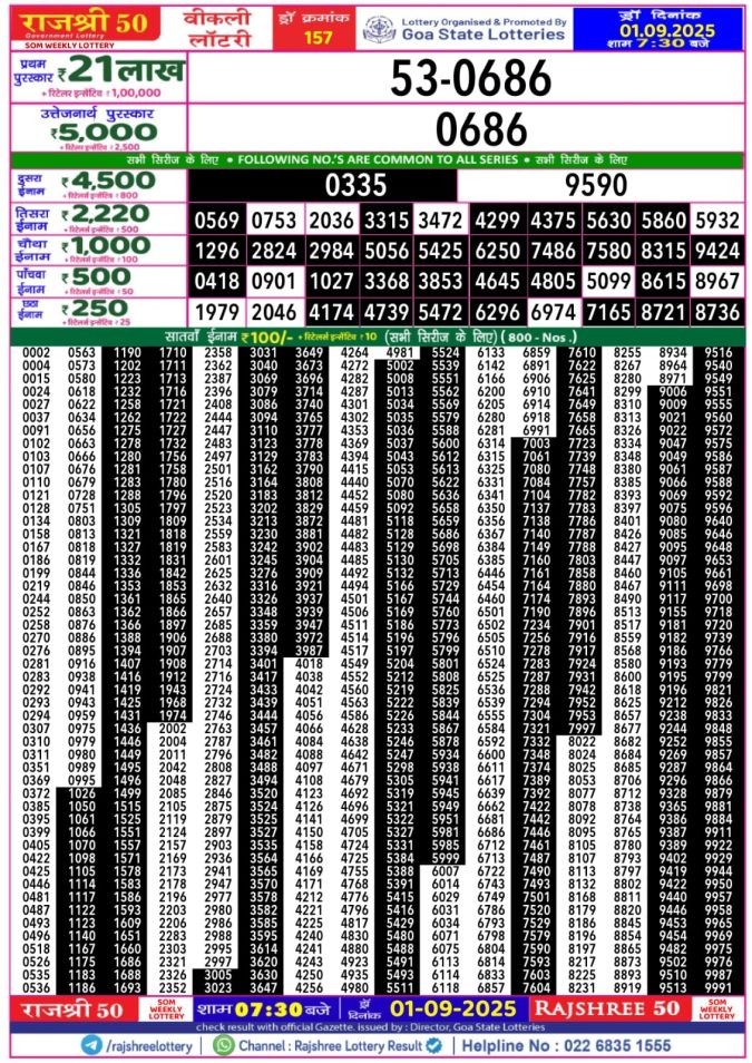 Goa Rajshree 50 Lottery Result Today 7:30 PM (01-09-2025)