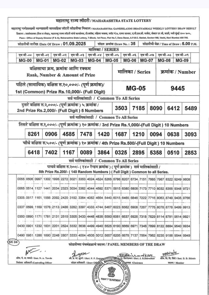 Maharashtra Ganeshlaxmi Lottery Result Today 5 PM (01-09-2025)
