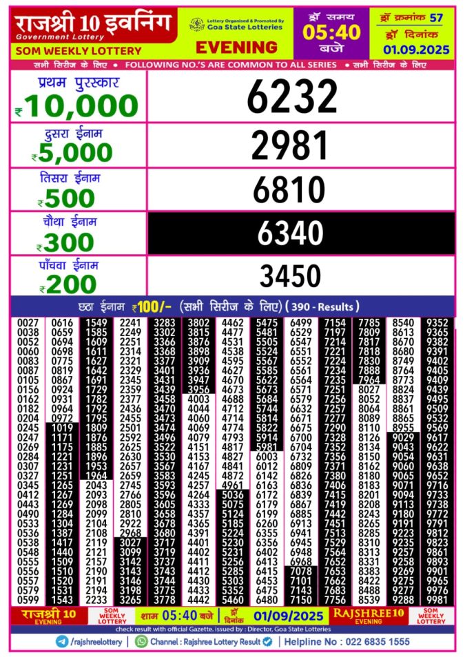Goa Rajshree 10 Evening Lottery Result Today 5:40 PM (01-09-2025)