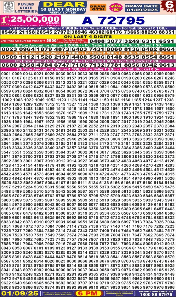 Punjab State Dear 50 Lottery Result Today 6 PM (01-09-2025)