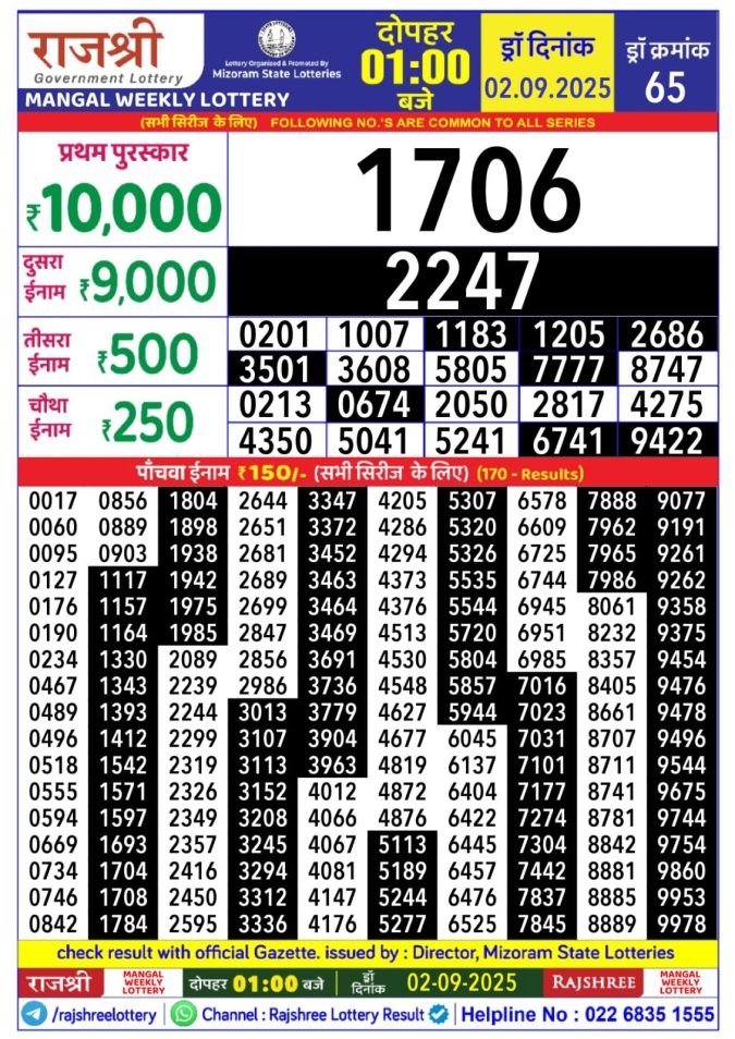 Mizoram Rajshree Lottery Result Today 1 PM (02-09-2025)