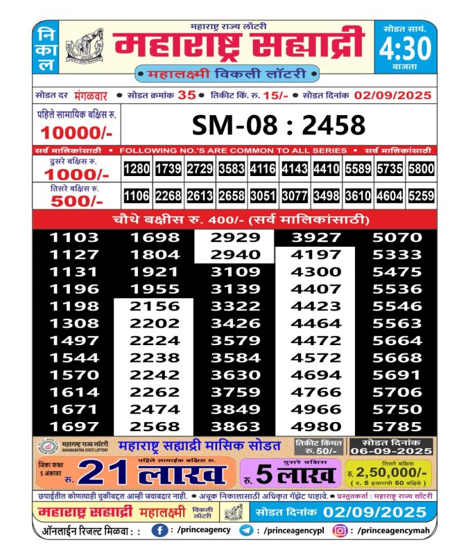 Maharashtra Sahyadri Lottery Result Today 4.30 PM (02-09-2025)