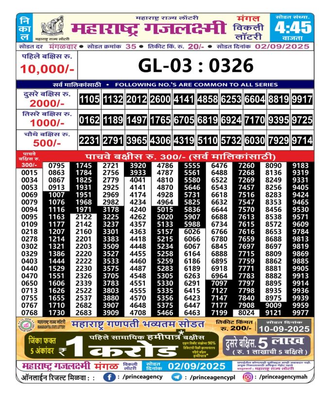 Maharashtra Gajlaxmi Lottery Result Today 4.45 PM (02-09-2025)