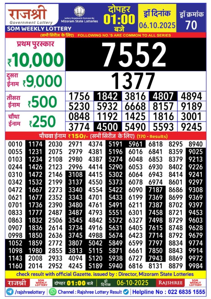 Mizoram Rajshree Lottery Result Today 1 PM (06-10-2025)