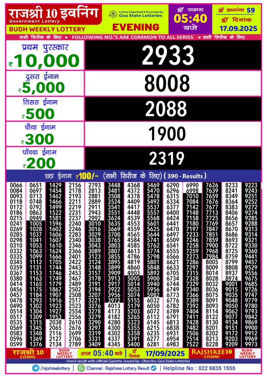 Goa Rajshree 10 Evening Lottery Result Today 5:40 PM (17-09-2025) Leave a Comment on Goa Rajshree 10 Evening Lottery Result Today 5:40 PM (17-09-2025) Posted in Lottery Sambad Results Share: TwitterFacebookPinterestRedditVKDiggLinkedinMix Related Results 0 102 Sikkim State Dear 10 Lottery Result Today 7 PM 25-04-2025 Sikkim State Dear 10 Lottery Result Today 7 PM 25-04-2025 Sikkim State Dear 10 Lottery Result Today 7 PM 25-04-2025 Sikkim State Dear 10 Lottery Result Today 7 PM 25-04-2025 Sikkim State Dear 10 Lottery Result Today 7 PM 25-04-2025 0 26 Maharashtra Gajlaxmi Lottery Result Today 4.45 PM (14-09-2025) Maharashtra Gajlaxmi Lottery Result Today 4.45 PM (14-09-2025) Maharashtra Gajlaxmi Lottery Result Today 4.45 PM (14-09-2025) Maharashtra Gajlaxmi Lottery Result Today 4.45 PM (14-09-2025) Maharashtra Gajlaxmi Lottery Result Today 4.45 PM (14-09-2025) 0 92 Maharashtra Lottery Result Today 4 PM 12-05-2025 Maharashtra Lottery Result Today 4 PM 12-05-2025 Maharashtra Lottery Result Today 4 PM 12-05-2025 Maharashtra Lottery Result Today 4 PM 12-05-2025 Maharashtra Lottery Result Today 4 PM 12-05-2025 0 45 Maharashtra Gajlaxmi Lottery Result Today 4.45 PM (03-08-2025) Maharashtra Gajlaxmi Lottery Result Today 4.45 PM (03-08-2025) Maharashtra Gajlaxmi Lottery Result Today 4.45 PM (03-08-2025) Maharashtra Gajlaxmi Lottery Result Today 4.45 PM (03-08-2025) Maharashtra Gajlaxmi Lottery Result Today 4.45 PM (03-08-2025)