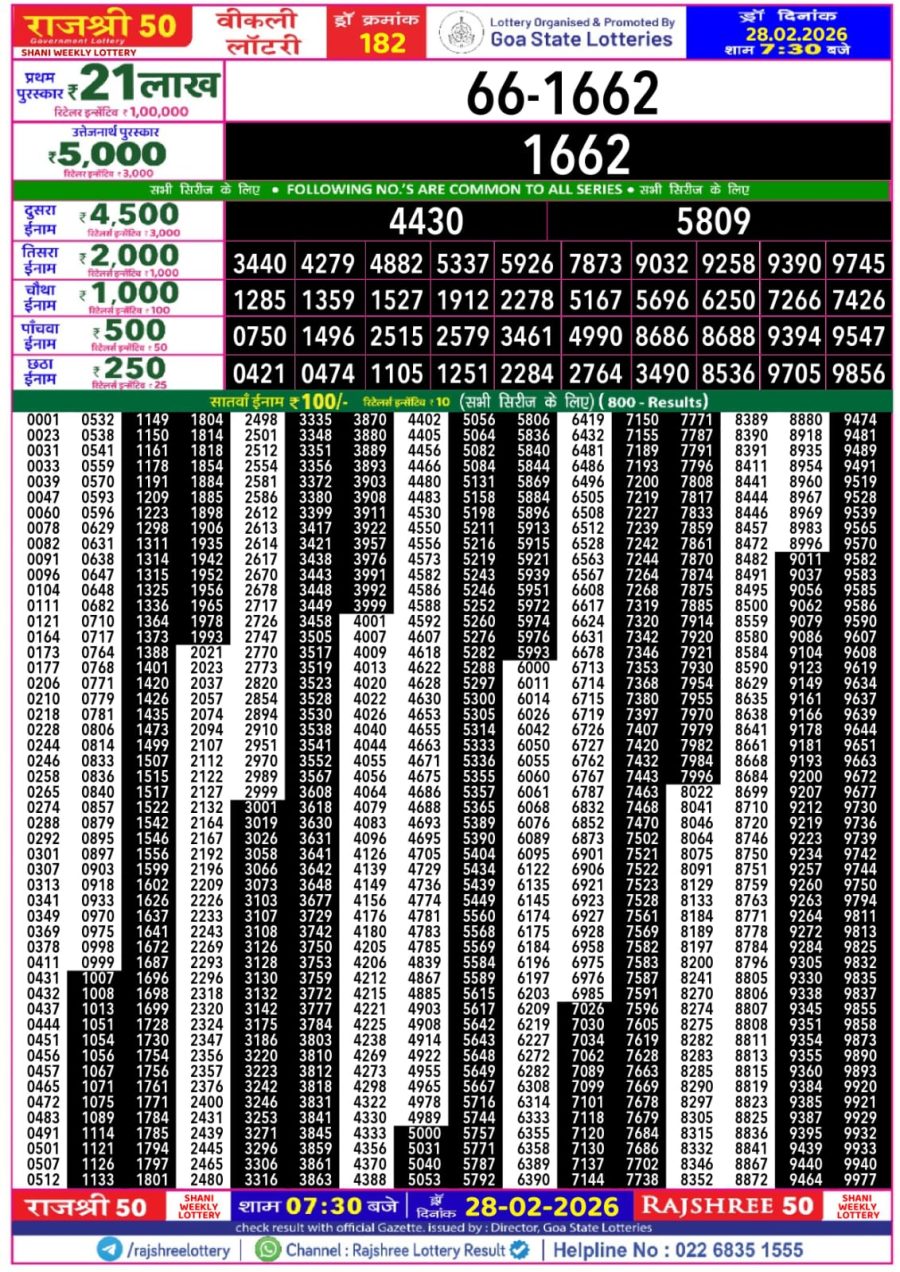 Goa State Rajshree 50 Lottery Result Today 7:30PM [28-02-2026] Leave a Comment on Goa State Rajshree 50 Lottery Result Today 7:30PM [28-02-2026] Posted in Lottery Sambad Results Share: TwitterFacebookPinterestRedditVKDiggLinkedinMix Related Results 0 93 Mizoram Rajshree Lottery Result Today 4 PM (03-08-2025) Mizoram Rajshree Lottery Result Today 4 PM (03-08-2025) Mizoram Rajshree Lottery Result Today 4 PM (03-08-2025) Mizoram Rajshree Lottery Result Today 4 PM (03-08-2025) Mizoram Rajshree Lottery Result Today 4 PM (03-08-2025) 0 134 Sikkim State Dear 10 Lottery Result Today 7 PM 18-05-2025 Sikkim State Dear 10 Lottery Result Today 7 PM 18-05-2025 Sikkim State Dear 10 Lottery Result Today 7 PM 18-05-2025 Sikkim State Dear 10 Lottery Result Today 7 PM 18-05-2025 Sikkim State Dear 10 Lottery Result Today 7 PM 18-05-2025 0 34 Punjab State Dear 50 Lottery Result Today 6PM [17-01-2026] Punjab State Dear 50 Lottery Result Today 6PM [17-01-2026] Punjab State Dear 50 Lottery Result Today 6PM [17-01-2026] Punjab State Dear 50 Lottery Result Today 6PM [17-01-2026] Punjab State Dear 50 Lottery Result Today 6PM [17-01-2026] 0 83 Goa Rajshree 50 Lottery Result Today 7:30 PM (27-08-2025) Goa Rajshree 50 Lottery Result Today 7:30 PM (27-08-2025) Goa Rajshree 50 Lottery Result Today 7:30 PM (27-08-2025) Goa Rajshree 50 Lottery Result Today 7:30 PM (27-08-2025) Goa Rajshree 50 Lottery Result Today 7:30 PM (27-08-2025)