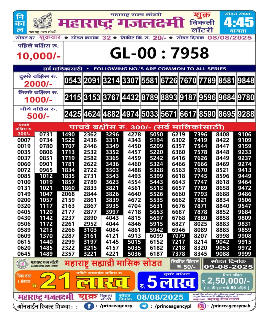 Maharashtra Gajlaxmi Lottery Result Today 4.45 PM (08-08-2025) Leave a Comment on Maharashtra Gajlaxmi Lottery Result Today 4.45 PM (08-08-2025) Posted in Lottery Sambad Results Share: TwitterFacebookPinterestRedditVKDiggLinkedinMix Related Results 0 33 Maharashtra Gajlaxmi Lottery Result Today 4.45 PM (24-08-2025) Maharashtra Gajlaxmi Lottery Result Today 4.45 PM (24-08-2025) Maharashtra Gajlaxmi Lottery Result Today 4.45 PM (24-08-2025) Maharashtra Gajlaxmi Lottery Result Today 4.45 PM (24-08-2025) Maharashtra Gajlaxmi Lottery Result Today 4.45 PM (24-08-2025) 0 52 Maharashtra Ganeshlaxmi Lottery Result Today 5 PM (09-07-2025) Maharashtra Ganeshlaxmi Lottery Result Today 5 PM (09-07-2025) Maharashtra Ganeshlaxmi Lottery Result Today 5 PM (09-07-2025) Maharashtra Ganeshlaxmi Lottery Result Today 5 PM (09-07-2025) Maharashtra Ganeshlaxmi Lottery Result Today 5 PM (09-07-2025) 0 52 Maharashtra Gajlaxmi Lottery Result Today 4.45 PM (17-07-2025) Maharashtra Gajlaxmi Lottery Result Today 4.45 PM (17-07-2025) Maharashtra Gajlaxmi Lottery Result Today 4.45 PM (17-07-2025) Maharashtra Gajlaxmi Lottery Result Today 4.45 PM (17-07-2025) Maharashtra Gajlaxmi Lottery Result Today 4.45 PM (17-07-2025) 0 72 Goa State Rajshree 50 Lottery Result Today 7.30 PM 08-06-2025 Goa State Rajshree 50 Lottery Result Today 7.30 PM 08-06-2025 Goa State Rajshree 50 Lottery Result Today 7.30 PM 08-06-2025 Goa State Rajshree 50 Lottery Result Today 7.30 PM 08-06-2025 Goa State Rajshree 50 Lottery Result Today 7.30 PM 08-06-2025
