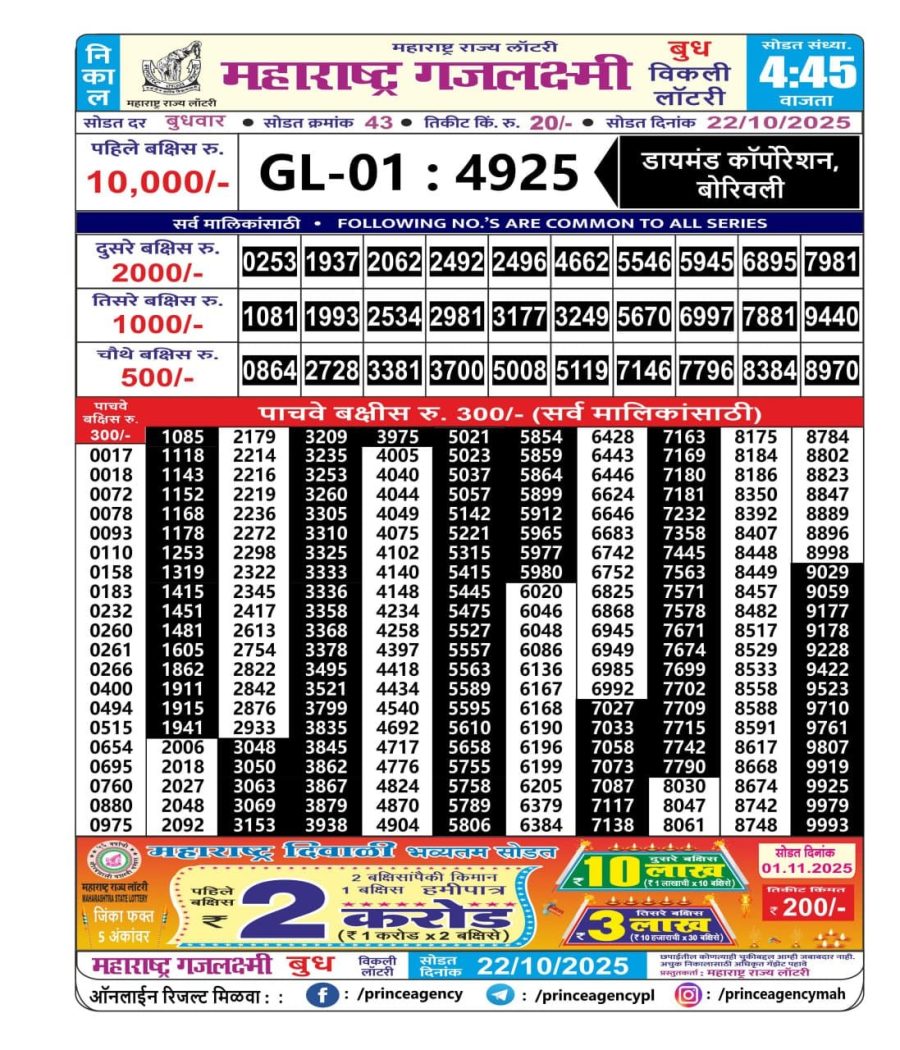 Maharashtra Gajlaxmi Lottery Result Today 4.45 PM (22-10-2025) Leave a Comment on Maharashtra Gajlaxmi Lottery Result Today 4.45 PM (22-10-2025) Posted in Lottery Sambad Results Share: TwitterFacebookPinterestRedditVKDiggLinkedinMix Related Results 0 35 Punjab State Dear 50 Lottery Result Today 6 PM (19-10-2025) Punjab State Dear 50 Lottery Result Today 6 PM (19-10-2025) Punjab State Dear 50 Lottery Result Today 6 PM (19-10-2025) Punjab State Dear 50 Lottery Result Today 6 PM (19-10-2025) Punjab State Dear 50 Lottery Result Today 6 PM (19-10-2025) 0 104 Punjab Lottery Result Today Dear 10 6 PM 30-05-2025 Punjab Lottery Result Today Dear 10 6 PM 30-05-2025 Punjab Lottery Result Today Dear 10 6 PM 30-05-2025 Punjab Lottery Result Today Dear 10 6 PM 30-05-2025 Punjab Lottery Result Today Dear 10 6 PM 30-05-2025 0 56 Nagaland Dear Lottery Result Today 8 PM (02-08-2025) Nagaland Dear Lottery Result Today 8 PM (02-08-2025) Nagaland Dear Lottery Result Today 8 PM (02-08-2025) Nagaland Dear Lottery Result Today 8 PM (02-08-2025) Nagaland Dear Lottery Result Today 8 PM (02-08-2025) 0 49 Sikkim Dear Lottery Result Today 6 PM (07-09-2025) Sikkim Dear Lottery Result Today 6 PM (07-09-2025) Sikkim Dear Lottery Result Today 6 PM (07-09-2025) Sikkim Dear Lottery Result Today 6 PM (07-09-2025) Sikkim Dear Lottery Result Today 6 PM (07-09-2025)