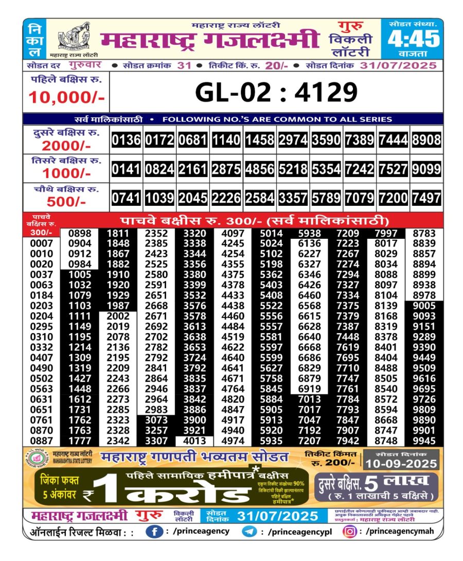 Maharashtra Gajlaxmi Lottery Result Today 4.45 PM (31-07-2025) Leave a Comment on Maharashtra Gajlaxmi Lottery Result Today 4.45 PM (31-07-2025) Posted in Lottery Sambad Results Share: TwitterFacebookPinterestRedditVKDiggLinkedinMix Related Results 0 21 Goa Rajshree 30 Lottery Result Today 8:30 PM (14-09-2025) Goa Rajshree 30 Lottery Result Today 8:30 PM (14-09-2025) Goa Rajshree 30 Lottery Result Today 8:30 PM (14-09-2025) Goa Rajshree 30 Lottery Result Today 8:30 PM (14-09-2025) Goa Rajshree 30 Lottery Result Today 8:30 PM (14-09-2025) 0 85 Golden Lottery Results Today 9 PM 2-05-2025 Golden Lottery Results Today 9 PM 2-05-2025 Golden Lottery Results Today 9 PM 2-05-2025 Golden Lottery Results Today 9 PM 2-05-2025 Golden Lottery Results Today 9 PM 2-05-2025 0 7 Punjab State Dear 50 Lottery Result Today 6 PM (15-10-2025) Punjab State Dear 50 Lottery Result Today 6 PM (15-10-2025) Punjab State Dear 50 Lottery Result Today 6 PM (15-10-2025) Punjab State Dear 50 Lottery Result Today 6 PM (15-10-2025) Punjab State Dear 50 Lottery Result Today 6 PM (15-10-2025) 0 84 Arunachal State Dear 10 Lottery Result Today 1.30 PM 2-05-2025 Arunachal State Dear 10 Lottery Result Today 1.30 PM 2-05-2025 Arunachal State Dear 10 Lottery Result Today 1.30 PM 2-05-2025 Arunachal State Dear 10 Lottery Result Today 1.30 PM 2-05-2025 Arunachal State Dear 10 Lottery Result Today 1.30 PM 2-05-2025
