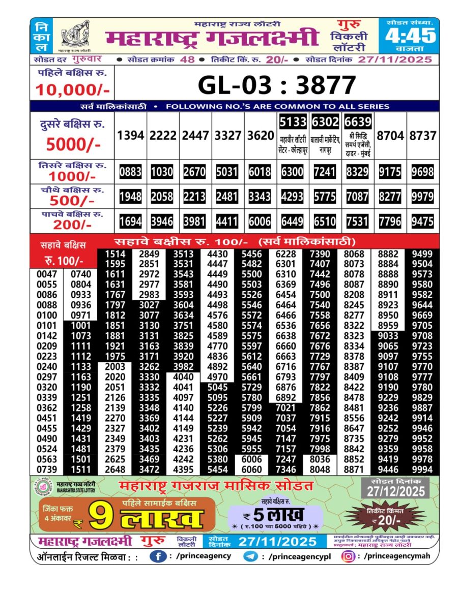 Maharashtra Gajlaxmi Lottery Result Today 4.45PM [27-11-2025] Leave a Comment on Maharashtra Gajlaxmi Lottery Result Today 4.45PM [27-11-2025] Posted in Lottery Sambad Results Share: TwitterFacebookPinterestRedditVKDiggLinkedinMix Related Results 0 55 Sikkim Dear 10 Lottery Result Today 7 PM (10-08-2025) Sikkim Dear 10 Lottery Result Today 7 PM (10-08-2025) Sikkim Dear 10 Lottery Result Today 7 PM (10-08-2025) Sikkim Dear 10 Lottery Result Today 7 PM (10-08-2025) Sikkim Dear 10 Lottery Result Today 7 PM (10-08-2025) 0 96 Golden Star Lottery Result Today 9 PM 17-06-2025 Golden Star Lottery Result Today 9 PM 17-06-2025 Golden Star Lottery Result Today 9 PM 17-06-2025 Golden Star Lottery Result Today 9 PM 17-06-2025 Golden Star Lottery Result Today 9 PM 17-06-2025 0 42 Goa Rajshree 100 Evening Lottery Result Today 6:30 PM (04-09-2025) Goa Rajshree 100 Evening Lottery Result Today 6:30 PM (04-09-2025) Goa Rajshree 100 Evening Lottery Result Today 6:30 PM (04-09-2025) Goa Rajshree 100 Evening Lottery Result Today 6:30 PM (04-09-2025) Goa Rajshree 100 Evening Lottery Result Today 6:30 PM (04-09-2025) 0 57 Goa Rajshree 30 Lottery Result Today 8:30 PM (29-07-2025) Goa Rajshree 30 Lottery Result Today 8:30 PM (29-07-2025) Goa Rajshree 30 Lottery Result Today 8:30 PM (29-07-2025) Goa Rajshree 30 Lottery Result Today 8:30 PM (29-07-2025) Goa Rajshree 30 Lottery Result Today 8:30 PM (29-07-2025)