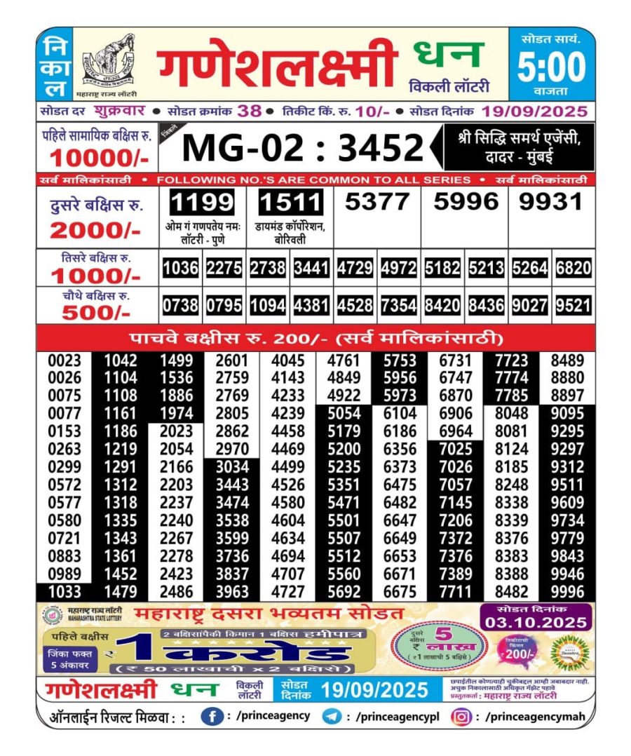 Maharashtra Ganeshlaxmi Lottery Result Today 5 PM (19-09-2025) Leave a Comment on Maharashtra Ganeshlaxmi Lottery Result Today 5 PM (19-09-2025) Posted in Lottery Sambad Results Share: TwitterFacebookPinterestRedditVKDiggLinkedinMix Related Results 0 50 Maharashtra Gajlaxmi Lottery Result Today 4.45 PM (08-07-2025) Maharashtra Gajlaxmi Lottery Result Today 4.45 PM (08-07-2025) Maharashtra Gajlaxmi Lottery Result Today 4.45 PM (08-07-2025) Maharashtra Gajlaxmi Lottery Result Today 4.45 PM (08-07-2025) Maharashtra Gajlaxmi Lottery Result Today 4.45 PM (08-07-2025) 0 35 Maharashtra Sahyadri Lottery Result Today 4.30 PM (21-08-2025) Maharashtra Sahyadri Lottery Result Today 4.30 PM (21-08-2025) Maharashtra Sahyadri Lottery Result Today 4.30 PM (21-08-2025) Maharashtra Sahyadri Lottery Result Today 4.30 PM (21-08-2025) Maharashtra Sahyadri Lottery Result Today 4.30 PM (21-08-2025) 0 26 Goa Rajshree 30 Lottery Result Today 8:30 PM (05-09-2025) Goa Rajshree 30 Lottery Result Today 8:30 PM (05-09-2025) Goa Rajshree 30 Lottery Result Today 8:30 PM (05-09-2025) Goa Rajshree 30 Lottery Result Today 8:30 PM (05-09-2025) Goa Rajshree 30 Lottery Result Today 8:30 PM (05-09-2025) 0 86 Maharashtra Gajraj Monthly Lottery Result 27-05-2025 Maharashtra Gajraj Monthly Lottery Result 27-05-2025 Maharashtra Gajraj Monthly Lottery Result 27-05-2025 Maharashtra Gajraj Monthly Lottery Result 27-05-2025 Maharashtra Gajraj Monthly Lottery Result 27-05-2025