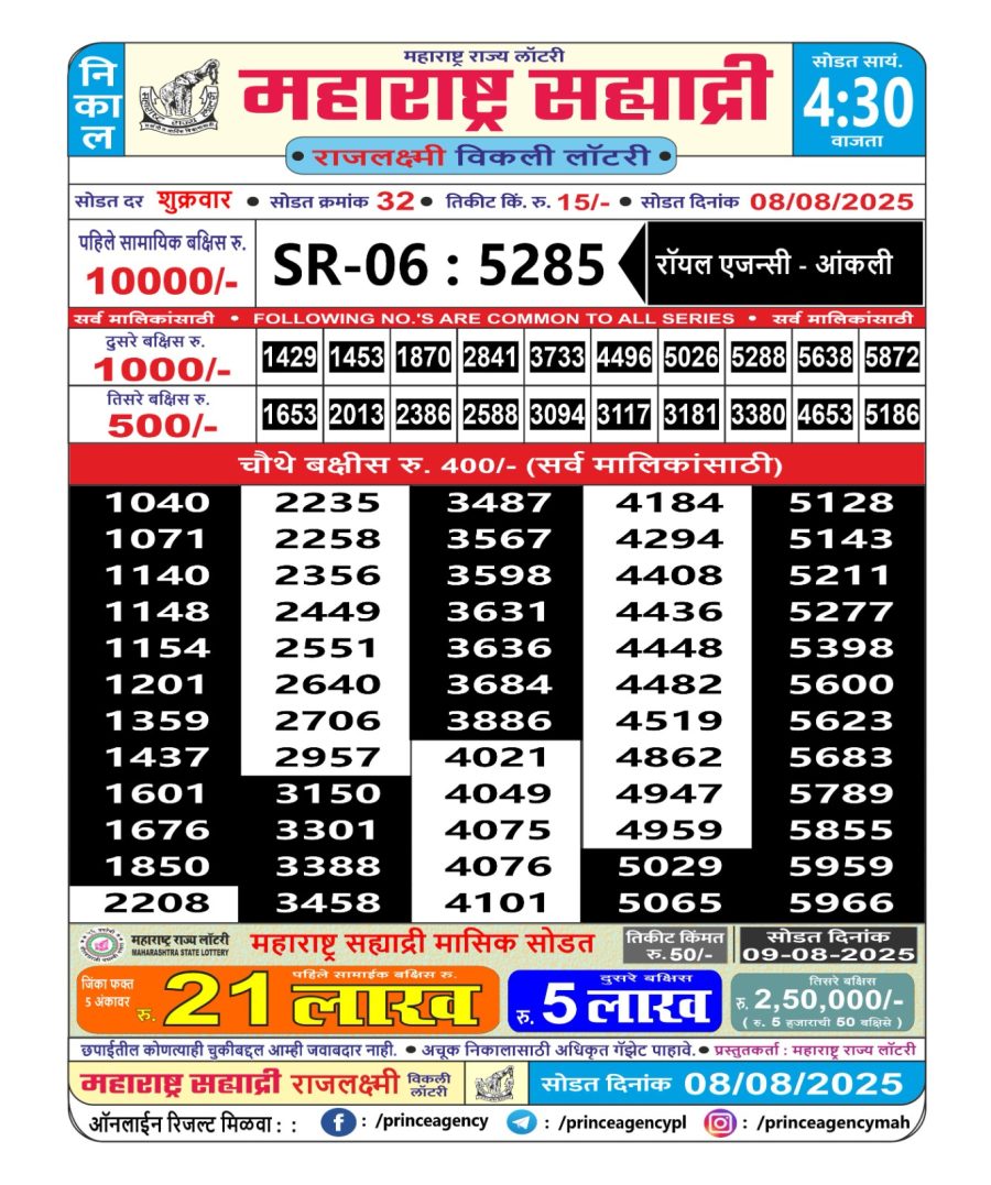 Maharashtra Sahyadri Lottery Result Today 4.30 PM (08-08-2025) Leave a Comment on Maharashtra Sahyadri Lottery Result Today 4.30 PM (08-08-2025) Posted in Lottery Sambad Results Share: TwitterFacebookPinterestRedditVKDiggLinkedinMix Related Results 0 33 Goa Rajshree 10 Evening Lottery Result Today 5:40 PM (10-08-2025) Goa Rajshree 10 Evening Lottery Result Today 5:40 PM (10-08-2025) Goa Rajshree 10 Evening Lottery Result Today 5:40 PM (10-08-2025) Goa Rajshree 10 Evening Lottery Result Today 5:40 PM (10-08-2025) Goa Rajshree 10 Evening Lottery Result Today 5:40 PM (10-08-2025) 0 61 Maharashtra Gaj Laxmi Lottery Result Today 4.45 PM 15-06-2025 Maharashtra Gaj Laxmi Lottery Result Today 4.45 PM 15-06-2025 Maharashtra Gaj Laxmi Lottery Result Today 4.45 PM 15-06-2025 Maharashtra Gaj Laxmi Lottery Result Today 4.45 PM 15-06-2025 Maharashtra Gaj Laxmi Lottery Result Today 4.45 PM 15-06-2025 0 45 Sikkim Dear Lottery Result Today 6 PM (30-07-2025) Sikkim Dear Lottery Result Today 6 PM (30-07-2025) Sikkim Dear Lottery Result Today 6 PM (30-07-2025) Sikkim Dear Lottery Result Today 6 PM (30-07-2025) Sikkim Dear Lottery Result Today 6 PM (30-07-2025) 0 48 Maharashtra Ganeshlaxmi Lottery Result Today 5 PM (23-07-2025) Maharashtra Ganeshlaxmi Lottery Result Today 5 PM (23-07-2025) Maharashtra Ganeshlaxmi Lottery Result Today 5 PM (23-07-2025) Maharashtra Ganeshlaxmi Lottery Result Today 5 PM (23-07-2025) Maharashtra Ganeshlaxmi Lottery Result Today 5 PM (23-07-2025)