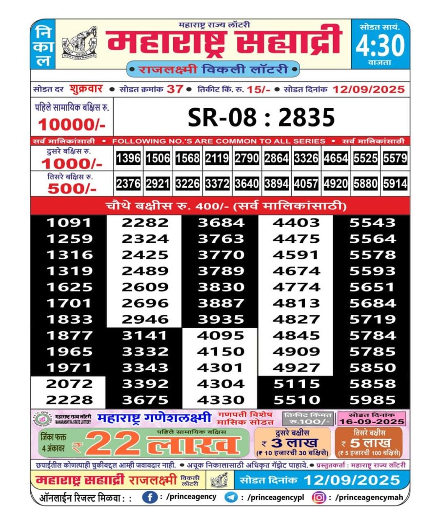 Maharashtra Sahyadri Lottery Result Today 4.30 PM (12-09-2025) Leave a Comment on Maharashtra Sahyadri Lottery Result Today 4.30 PM (12-09-2025) Posted in Lottery Sambad Results Share: TwitterFacebookPinterestRedditVKDiggLinkedinMix Related Results 0 38 Mizoram Rajshree Lottery Result Today 4 PM (09-08-2025) Mizoram Rajshree Lottery Result Today 4 PM (09-08-2025) Mizoram Rajshree Lottery Result Today 4 PM (09-08-2025) Mizoram Rajshree Lottery Result Today 4 PM (09-08-2025) Mizoram Rajshree Lottery Result Today 4 PM (09-08-2025) 0 65 Mizoram Rajshree Lottery Result Today 4 PM (01-07-2025) Mizoram Rajshree Lottery Result Today 4 PM (01-07-2025) Mizoram Rajshree Lottery Result Today 4 PM (01-07-2025) Mizoram Rajshree Lottery Result Today 4 PM (01-07-2025) Mizoram Rajshree Lottery Result Today 4 PM (01-07-2025) 0 75 Punjab Dear 10 Lottery Result Today 6 PM (25-06-2025) Punjab Dear 10 Lottery Result Today 6 PM (25-06-2025) Punjab Dear 10 Lottery Result Today 6 PM (25-06-2025) Punjab Dear 10 Lottery Result Today 6 PM (25-06-2025) Punjab Dear 10 Lottery Result Today 6 PM (25-06-2025) 0 62 Nagaland Dear Lottery Result Today 8 PM (06-07-2025) Nagaland Dear Lottery Result Today 8 PM (06-07-2025) Nagaland Dear Lottery Result Today 8 PM (06-07-2025) Nagaland Dear Lottery Result Today 8 PM (06-07-2025) Nagaland Dear Lottery Result Today 8 PM (06-07-2025)