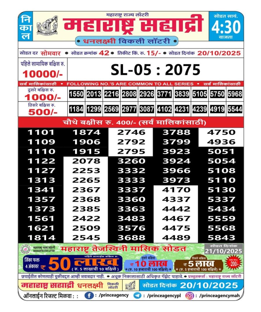 Maharashtra Sahyadri Lottery Result Today 4.30 PM (20-10-2025) Leave a Comment on Maharashtra Sahyadri Lottery Result Today 4.30 PM (20-10-2025) Posted in Lottery Sambad Results Share: TwitterFacebookPinterestRedditVKDiggLinkedinMix Related Results 0 22 Punjab State Dear 50 Lottery Result Today 6 PM (24-09-2025) Punjab State Dear 50 Lottery Result Today 6 PM (24-09-2025) Punjab State Dear 50 Lottery Result Today 6 PM (24-09-2025) Punjab State Dear 50 Lottery Result Today 6 PM (24-09-2025) Punjab State Dear 50 Lottery Result Today 6 PM (24-09-2025) 0 15 Goa Rajshree 50 Lottery Result Today 7:30 PM (13-10-2025) Goa Rajshree 50 Lottery Result Today 7:30 PM (13-10-2025) Goa Rajshree 50 Lottery Result Today 7:30 PM (13-10-2025) Goa Rajshree 50 Lottery Result Today 7:30 PM (13-10-2025) Goa Rajshree 50 Lottery Result Today 7:30 PM (13-10-2025) 0 75 Nagaland State Super Lottery Result Today 7 PM 28-05-2025 Nagaland State Super Lottery Result Today 7 PM 28-05-2025 Nagaland State Super Lottery Result Today 7 PM 28-05-2025 Nagaland State Super Lottery Result Today 7 PM 28-05-2025 Nagaland State Super Lottery Result Today 7 PM 28-05-2025 0 30 Sikkim Dear Lottery Result Today 6 PM (11-09-2025) Sikkim Dear Lottery Result Today 6 PM (11-09-2025) Sikkim Dear Lottery Result Today 6 PM (11-09-2025) Sikkim Dear Lottery Result Today 6 PM (11-09-2025) Sikkim Dear Lottery Result Today 6 PM (11-09-2025)