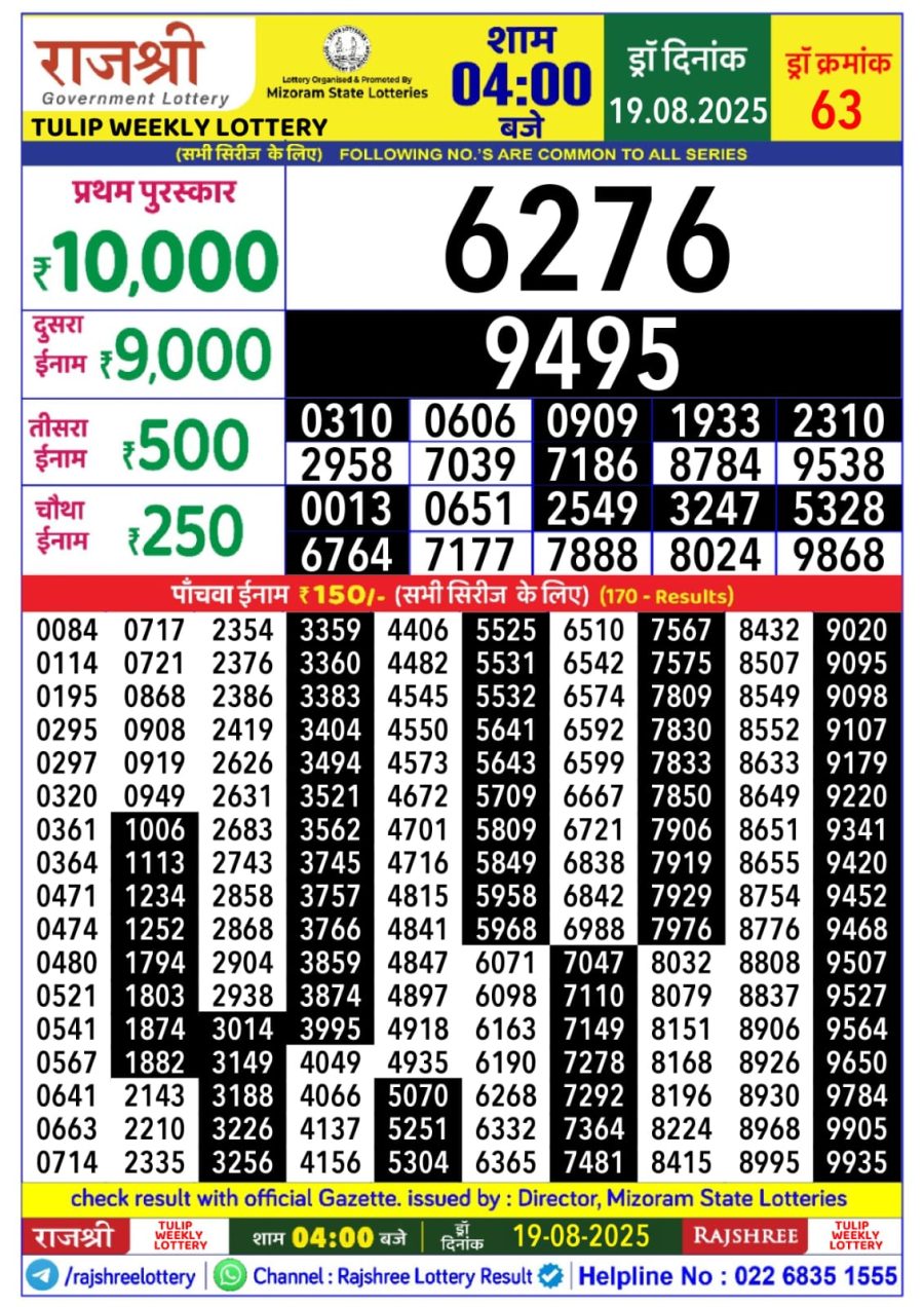 Mizoram Rajshree Lottery Result Today 4 PM (19-08-2025) Leave a Comment on Mizoram Rajshree Lottery Result Today 4 PM (19-08-2025) Posted in Lottery Sambad Results Share: TwitterFacebookPinterestRedditVKDiggLinkedinMix Related Results 0 80 Golden Lottery Results Today 9 PM 19-05-2025 Golden Lottery Results Today 9 PM 19-05-2025 Golden Lottery Results Today 9 PM 19-05-2025 Golden Lottery Results Today 9 PM 19-05-2025 Golden Lottery Results Today 9 PM 19-05-2025 0 97 Maharashtra Lottery Result Today 4 PM 24-04-2025 Maharashtra Lottery Result Today 4 PM 24-04-2025 Maharashtra Lottery Result Today 4 PM 24-04-2025 Maharashtra Lottery Result Today 4 PM 24-04-2025 Maharashtra Lottery Result Today 4 PM 24-04-2025 0 3 Sikkim Labh Laxmi Lottery Result Today 4 PM (16-10-2025) Sikkim Labh Laxmi Lottery Result Today 4 PM (16-10-2025) Sikkim Labh Laxmi Lottery Result Today 4 PM (16-10-2025) Sikkim Labh Laxmi Lottery Result Today 4 PM (16-10-2025) Sikkim Labh Laxmi Lottery Result Today 4 PM (16-10-2025) 0 16 Nagaland Dear Lottery Result Today 1 PM (08-10-2025) Nagaland Dear Lottery Result Today 1 PM (08-10-2025) Nagaland Dear Lottery Result Today 1 PM (08-10-2025) Nagaland Dear Lottery Result Today 1 PM (08-10-2025) Nagaland Dear Lottery Result Today 1 PM (08-10-2025)