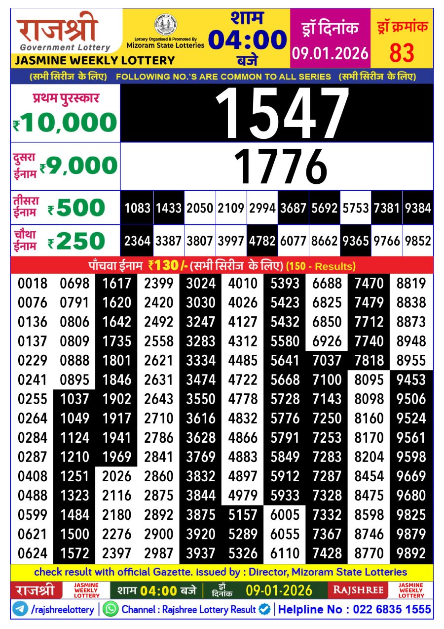 Mizoram Rajshree Lottery Result Today 4PM [09-01-2026] Leave a Comment on Mizoram Rajshree Lottery Result Today 4PM [09-01-2026] Posted in Lottery Sambad Results Share: TwitterFacebookPinterestRedditVKDiggLinkedinMix Related Results 0 33 Maharashtra Ganeshlaxmi Lottery Result Today 5PM [05-12-2025] Maharashtra Ganeshlaxmi Lottery Result Today 5PM [05-12-2025] Maharashtra Ganeshlaxmi Lottery Result Today 5PM [05-12-2025] Maharashtra Ganeshlaxmi Lottery Result Today 5PM [05-12-2025] Maharashtra Ganeshlaxmi Lottery Result Today 5PM [05-12-2025] 0 90 Goa Rajshree 10 Evening Lottery Result Today 5:40 PM (15-07-2025) Goa Rajshree 10 Evening Lottery Result Today 5:40 PM (15-07-2025) Goa Rajshree 10 Evening Lottery Result Today 5:40 PM (15-07-2025) Goa Rajshree 10 Evening Lottery Result Today 5:40 PM (15-07-2025) Goa Rajshree 10 Evening Lottery Result Today 5:40 PM (15-07-2025) 0 68 Nagaland Dear Lottery Result Today 8 PM (11-08-2025) Nagaland Dear Lottery Result Today 8 PM (11-08-2025) Nagaland Dear Lottery Result Today 8 PM (11-08-2025) Nagaland Dear Lottery Result Today 8 PM (11-08-2025) Nagaland Dear Lottery Result Today 8 PM (11-08-2025) 0 123 Punjab Lottery Result Today Dear 10 6 PM 06-06-2025 Punjab Lottery Result Today Dear 10 6 PM 06-06-2025 Punjab Lottery Result Today Dear 10 6 PM 06-06-2025 Punjab Lottery Result Today Dear 10 6 PM 06-06-2025 Punjab Lottery Result Today Dear 10 6 PM 06-06-2025