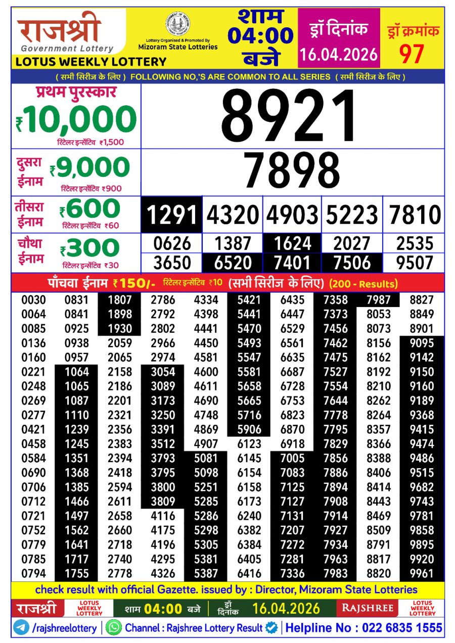 Mizoram Rajshree Lottery Result Today 4PM [16-04-2026] Leave a Comment on Mizoram Rajshree Lottery Result Today 4PM [16-04-2026] Posted in Rajshree Lottery Result Share: TwitterFacebookPinterestRedditVKDiggLinkedinMix Related Results 0 39 Goa Rajshree 9PM Night Lottery Result Today [15-03-2026] Goa Rajshree 9PM Night Lottery Result Today [15-03-2026] Goa Rajshree 9PM Night Lottery Result Today [15-03-2026] Goa Rajshree 9PM Night Lottery Result Today [15-03-2026] Goa Rajshree 9PM Night Lottery Result Today [15-03-2026] 0 15 Mizoram Rajshree Lottery Result Today 2.25PM [10-04-2026] Mizoram Rajshree Lottery Result Today 2.25PM [10-04-2026] Mizoram Rajshree Lottery Result Today 2.25PM [10-04-2026] Mizoram Rajshree Lottery Result Today 2.25PM [10-04-2026] Mizoram Rajshree Lottery Result Today 2.25PM [10-04-2026] 0 46 Rajshree Lottery Result Today 8PM [08-03-2026] Rajshree Lottery Result Today 8PM [08-03-2026] Rajshree Lottery Result Today 8PM [08-03-2026] Rajshree Lottery Result Today 8PM [08-03-2026] Rajshree Lottery Result Today 8PM [08-03-2026] 0 33 Rajshree Lottery Result Today 8PM [13-03-2026] Rajshree Lottery Result Today 8PM [13-03-2026] Rajshree Lottery Result Today 8PM [13-03-2026] Rajshree Lottery Result Today 8PM [13-03-2026] Rajshree Lottery Result Today 8PM [13-03-2026]