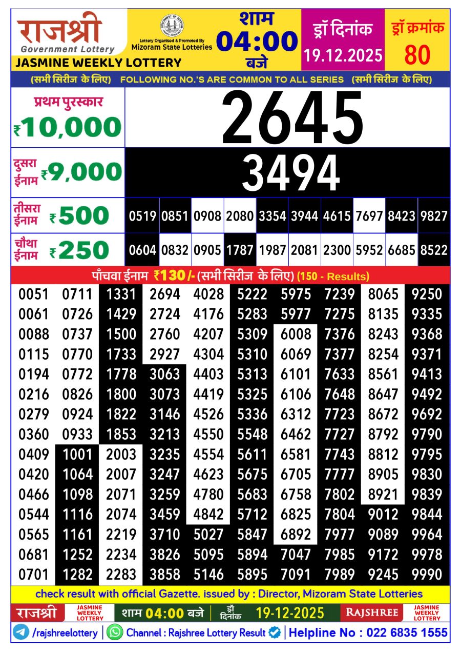 Mizoram Rajshree Lottery Result Today 4PM [19-12-2025] Leave a Comment on Mizoram Rajshree Lottery Result Today 4PM [19-12-2025] Posted in Lottery Sambad Results Share: TwitterFacebookPinterestRedditVKDiggLinkedinMix Related Results 0 53 Punjab State Dear 50 Lottery Result Today 6 PM (27-08-2025) Punjab State Dear 50 Lottery Result Today 6 PM (27-08-2025) Punjab State Dear 50 Lottery Result Today 6 PM (27-08-2025) Punjab State Dear 50 Lottery Result Today 6 PM (27-08-2025) Punjab State Dear 50 Lottery Result Today 6 PM (27-08-2025) 0 51 Mizoram Rajshree Lottery Result Today 1 PM (09-09-2025) Mizoram Rajshree Lottery Result Today 1 PM (09-09-2025) Mizoram Rajshree Lottery Result Today 1 PM (09-09-2025) Mizoram Rajshree Lottery Result Today 1 PM (09-09-2025) Mizoram Rajshree Lottery Result Today 1 PM (09-09-2025) 0 32 Maharashtra Gajlaxmi Lottery Result Today 4.45PM [05-11-2025] Maharashtra Gajlaxmi Lottery Result Today 4.45PM [05-11-2025] Maharashtra Gajlaxmi Lottery Result Today 4.45PM [05-11-2025] Maharashtra Gajlaxmi Lottery Result Today 4.45PM [05-11-2025] Maharashtra Gajlaxmi Lottery Result Today 4.45PM [05-11-2025] 0 50 Nagaland Dear Lottery Result Today 1 PM (16-09-2025) Nagaland Dear Lottery Result Today 1 PM (16-09-2025) Nagaland Dear Lottery Result Today 1 PM (16-09-2025) Nagaland Dear Lottery Result Today 1 PM (16-09-2025) Nagaland Dear Lottery Result Today 1 PM (16-09-2025)