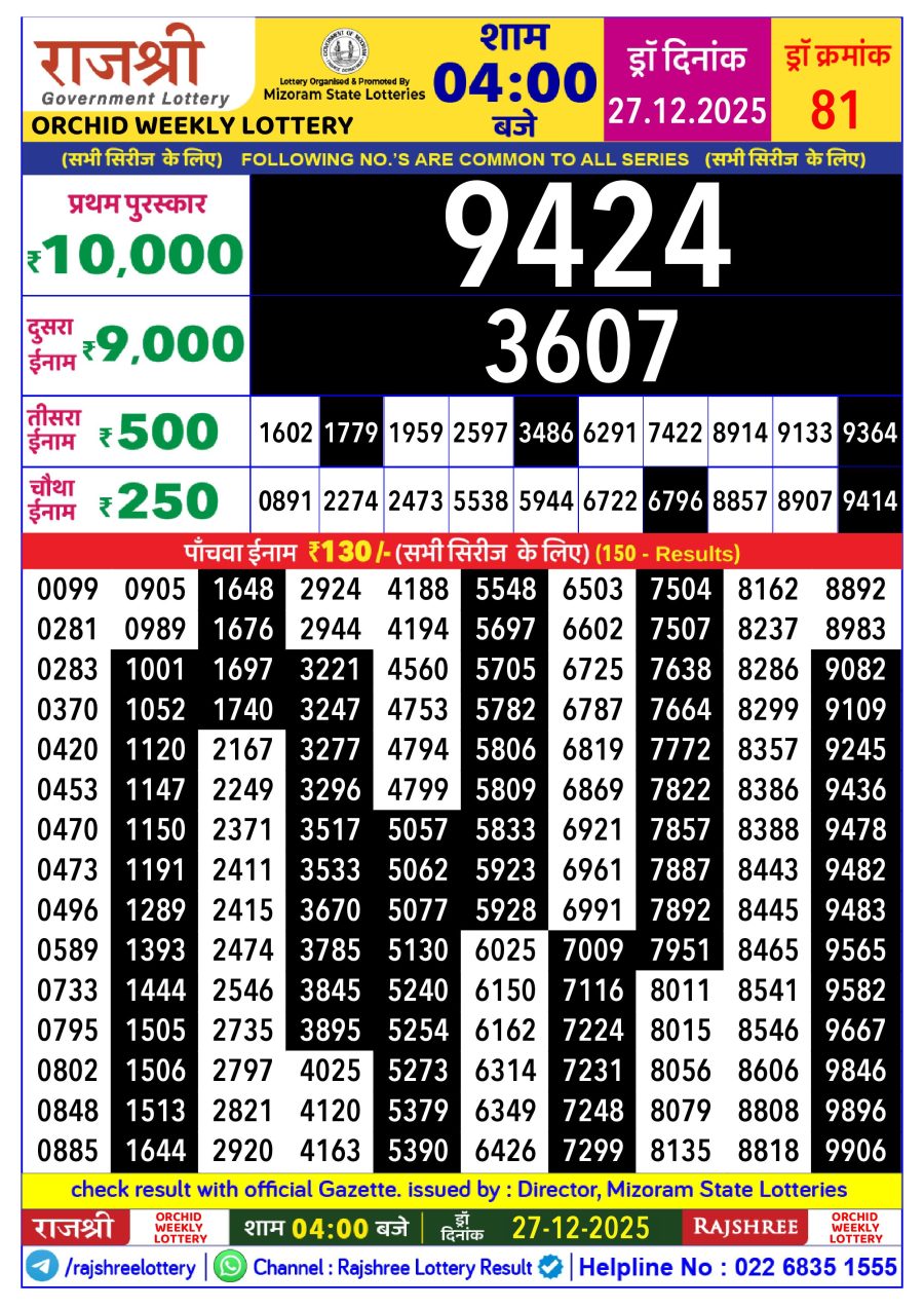 Mizoram Rajshree Lottery Result Today 4PM [27-12-2025] Leave a Comment on Mizoram Rajshree Lottery Result Today 4PM [27-12-2025] Posted in Lottery Sambad Results Share: TwitterFacebookPinterestRedditVKDiggLinkedinMix Related Results 0 131 Nagaland State Dear Lottery Result Today 1 PM 29-04-2025 Nagaland State Dear Lottery Result Today 1 PM 29-04-2025 Nagaland State Dear Lottery Result Today 1 PM 29-04-2025 Nagaland State Dear Lottery Result Today 1 PM 29-04-2025 Nagaland State Dear Lottery Result Today 1 PM 29-04-2025 0 15 Goa Rajshree 9PM Night Lottery Result Today [03-01-2026] Goa Rajshree 9PM Night Lottery Result Today [03-01-2026] Goa Rajshree 9PM Night Lottery Result Today [03-01-2026] Goa Rajshree 9PM Night Lottery Result Today [03-01-2026] Goa Rajshree 9PM Night Lottery Result Today [03-01-2026] 0 56 Sikkim Dear Lottery Result Today 6 PM (07-10-2025) Sikkim Dear Lottery Result Today 6 PM (07-10-2025) Sikkim Dear Lottery Result Today 6 PM (07-10-2025) Sikkim Dear Lottery Result Today 6 PM (07-10-2025) Sikkim Dear Lottery Result Today 6 PM (07-10-2025) 0 80 Arunachal Dear 10 Lottery Result Today 1:30 PM (01-08-2025) Arunachal Dear 10 Lottery Result Today 1:30 PM (01-08-2025) Arunachal Dear 10 Lottery Result Today 1:30 PM (01-08-2025) Arunachal Dear 10 Lottery Result Today 1:30 PM (01-08-2025) Arunachal Dear 10 Lottery Result Today 1:30 PM (01-08-2025)