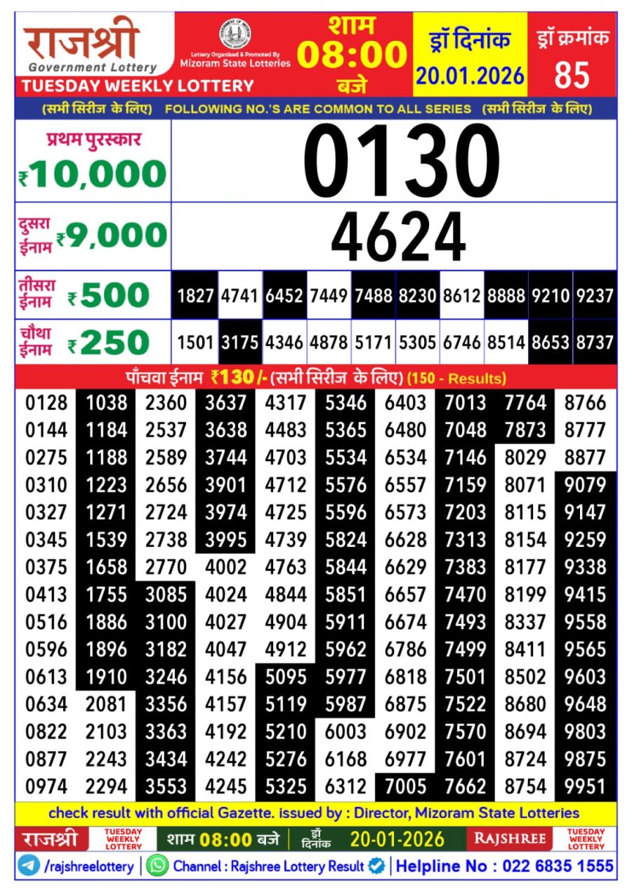Mizoram Rajshree Lottery Result Today 8PM [20-01-2026] Leave a Comment on Mizoram Rajshree Lottery Result Today 8PM [20-01-2026] Posted in Lottery Sambad Results Share: TwitterFacebookPinterestRedditVKDiggLinkedinMix Related Results 0 73 Mizoram Rajshree Lottery Result Today 4 PM (21-10-2025) Mizoram Rajshree Lottery Result Today 4 PM (21-10-2025) Mizoram Rajshree Lottery Result Today 4 PM (21-10-2025) Mizoram Rajshree Lottery Result Today 4 PM (21-10-2025) Mizoram Rajshree Lottery Result Today 4 PM (21-10-2025) 0 114 Sikkim State Dear Lottery Result Today 6 PM 19-05-2025 Sikkim State Dear Lottery Result Today 6 PM 19-05-2025 Sikkim State Dear Lottery Result Today 6 PM 19-05-2025 Sikkim State Dear Lottery Result Today 6 PM 19-05-2025 Sikkim State Dear Lottery Result Today 6 PM 19-05-2025 0 52 Maharashtra Gajlaxmi Lottery Result Today 4.45 PM (23-10-2025) Maharashtra Gajlaxmi Lottery Result Today 4.45 PM (23-10-2025) Maharashtra Gajlaxmi Lottery Result Today 4.45 PM (23-10-2025) Maharashtra Gajlaxmi Lottery Result Today 4.45 PM (23-10-2025) Maharashtra Gajlaxmi Lottery Result Today 4.45 PM (23-10-2025) 0 43 Maharashtra Ganeshlaxmi Lottery Result Today 5PM [06-11-2025] Maharashtra Ganeshlaxmi Lottery Result Today 5PM [06-11-2025] Maharashtra Ganeshlaxmi Lottery Result Today 5PM [06-11-2025] Maharashtra Ganeshlaxmi Lottery Result Today 5PM [06-11-2025] Maharashtra Ganeshlaxmi Lottery Result Today 5PM [06-11-2025]