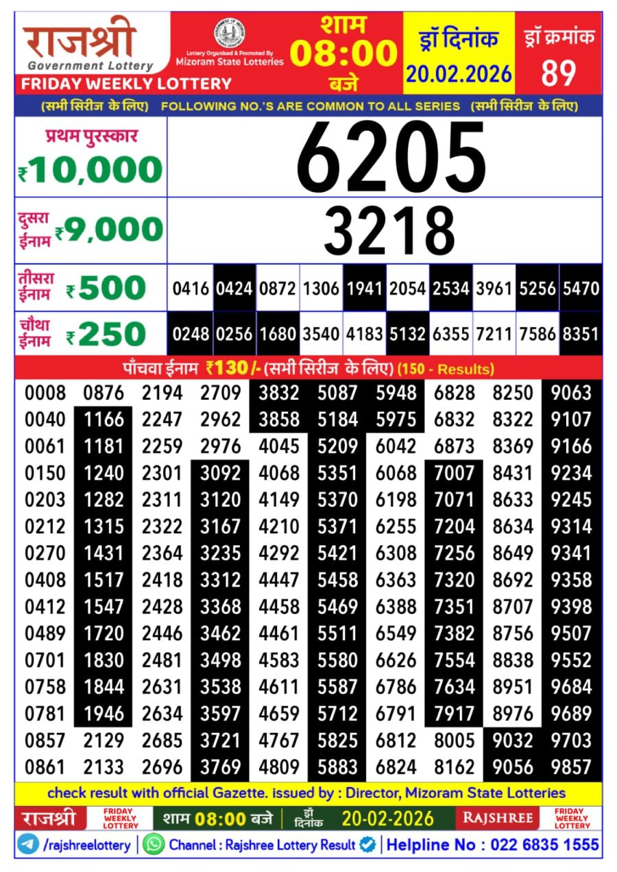 Mizoram Rajshree Lottery Result Today 8PM [20-02-2026] Leave a Comment on Mizoram Rajshree Lottery Result Today 8PM [20-02-2026] Posted in Lottery Sambad Results Share: TwitterFacebookPinterestRedditVKDiggLinkedinMix Related Results 0 29 Sikkim State Dear Lottery 6PM Result 23.12.2025 Sikkim State Dear Lottery 6PM Result 23.12.2025 Sikkim State Dear Lottery 6PM Result 23.12.2025 Sikkim State Dear Lottery 6PM Result 23.12.2025 Sikkim State Dear Lottery 6PM Result 23.12.2025 0 115 Golden 100 Monthly Lottery Result Today (02-07-2025) Golden 100 Monthly Lottery Result Today (02-07-2025) Golden 100 Monthly Lottery Result Today (02-07-2025) Golden 100 Monthly Lottery Result Today (02-07-2025) Golden 100 Monthly Lottery Result Today (02-07-2025) 0 30 Goa Rajshree 9PM Night Lottery Result Today [12-01-2026] Goa Rajshree 9PM Night Lottery Result Today [12-01-2026] Goa Rajshree 9PM Night Lottery Result Today [12-01-2026] Goa Rajshree 9PM Night Lottery Result Today [12-01-2026] Goa Rajshree 9PM Night Lottery Result Today [12-01-2026] 0 87 Goa Rajshree 10 Evening Lottery Result Today 5:40 PM (31-07-2025) Goa Rajshree 10 Evening Lottery Result Today 5:40 PM (31-07-2025) Goa Rajshree 10 Evening Lottery Result Today 5:40 PM (31-07-2025) Goa Rajshree 10 Evening Lottery Result Today 5:40 PM (31-07-2025) Goa Rajshree 10 Evening Lottery Result Today 5:40 PM (31-07-2025)