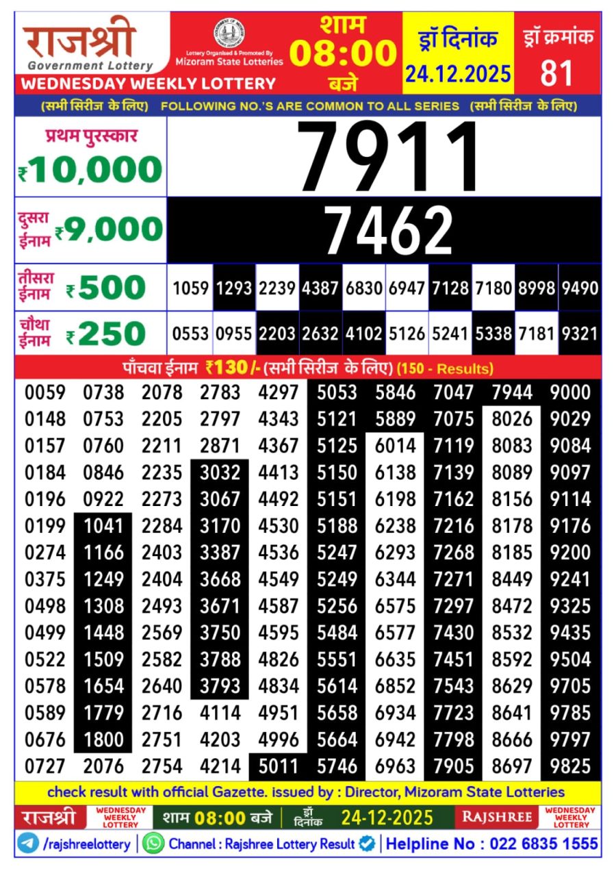 Mizoram Rajshree Lottery Result Today 8PM [24-12-2025] Leave a Comment on Mizoram Rajshree Lottery Result Today 8PM [24-12-2025] Posted in Lottery Sambad Results Share: TwitterFacebookPinterestRedditVKDiggLinkedinMix Related Results 0 58 Goa Rajshree 50 Lottery Result Today 7:30 PM (11-10-2025) Goa Rajshree 50 Lottery Result Today 7:30 PM (11-10-2025) Goa Rajshree 50 Lottery Result Today 7:30 PM (11-10-2025) Goa Rajshree 50 Lottery Result Today 7:30 PM (11-10-2025) Goa Rajshree 50 Lottery Result Today 7:30 PM (11-10-2025) 0 95 Nagaland Dear 50 Lottery Result Today 5 PM (13-07-2025) Nagaland Dear 50 Lottery Result Today 5 PM (13-07-2025) Nagaland Dear 50 Lottery Result Today 5 PM (13-07-2025) Nagaland Dear 50 Lottery Result Today 5 PM (13-07-2025) Nagaland Dear 50 Lottery Result Today 5 PM (13-07-2025) 0 108 Golden Star Lottery Result Today 9 PM 22-06-2025 Golden Star Lottery Result Today 9 PM 22-06-2025 Golden Star Lottery Result Today 9 PM 22-06-2025 Golden Star Lottery Result Today 9 PM 22-06-2025 Golden Star Lottery Result Today 9 PM 22-06-2025 0 98 Nagaland Dear Lottery Result Today 1 PM (10-07-2025) Nagaland Dear Lottery Result Today 1 PM (10-07-2025) Nagaland Dear Lottery Result Today 1 PM (10-07-2025) Nagaland Dear Lottery Result Today 1 PM (10-07-2025) Nagaland Dear Lottery Result Today 1 PM (10-07-2025)