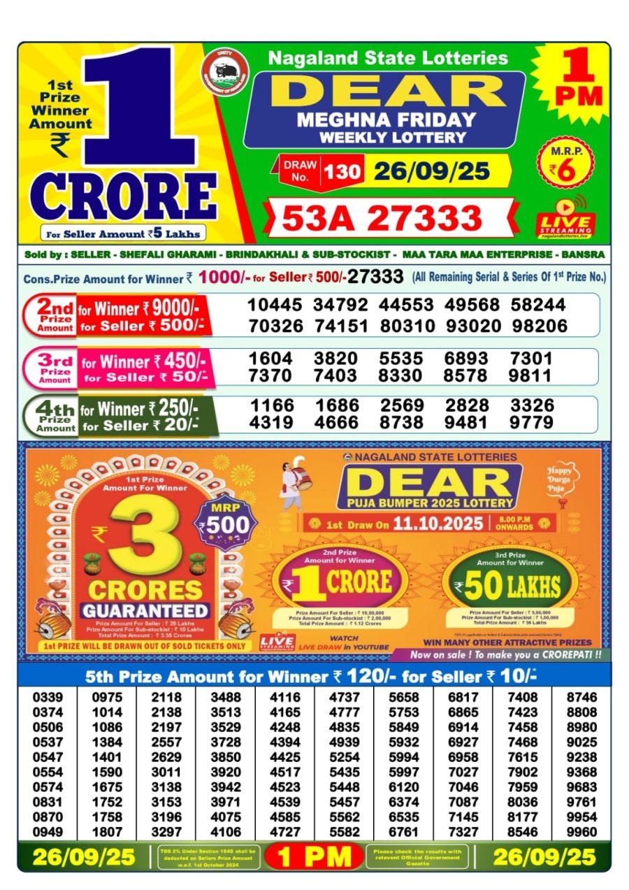 Nagaland Dear Lottery Result Today 1 PM (26-09-2025) Leave a Comment on Nagaland Dear Lottery Result Today 1 PM (26-09-2025) Posted in Lottery Sambad Results Share: TwitterFacebookPinterestRedditVKDiggLinkedinMix Related Results 0 65 Nagaland State Dear Lottery Result Today 1 PM Declared 23-06-2025 Nagaland State Dear Lottery Result Today 1 PM Declared 23-06-2025 Nagaland State Dear Lottery Result Today 1 PM Declared 23-06-2025 Nagaland State Dear Lottery Result Today 1 PM Declared 23-06-2025 Nagaland State Dear Lottery Result Today 1 PM Declared 23-06-2025 0 24 Goa Rajshree 50 Lottery Result Today 7:30 PM (28-09-2025) Goa Rajshree 50 Lottery Result Today 7:30 PM (28-09-2025) Goa Rajshree 50 Lottery Result Today 7:30 PM (28-09-2025) Goa Rajshree 50 Lottery Result Today 7:30 PM (28-09-2025) Goa Rajshree 50 Lottery Result Today 7:30 PM (28-09-2025) 0 68 Maharashtra Gaj Laxmi Lottery Result Today 4.45 PM 07-06-2025 Maharashtra Gaj Laxmi Lottery Result Today 4.45 PM 07-06-2025 Maharashtra Gaj Laxmi Lottery Result Today 4.45 PM 07-06-2025 Maharashtra Gaj Laxmi Lottery Result Today 4.45 PM 07-06-2025 Maharashtra Gaj Laxmi Lottery Result Today 4.45 PM 07-06-2025 0 55 Nagaland Dear 100 Lottery Result Today 5 PM (19-07-2025) Nagaland Dear 100 Lottery Result Today 5 PM (19-07-2025) Nagaland Dear 100 Lottery Result Today 5 PM (19-07-2025) Nagaland Dear 100 Lottery Result Today 5 PM (19-07-2025) Nagaland Dear 100 Lottery Result Today 5 PM (19-07-2025)