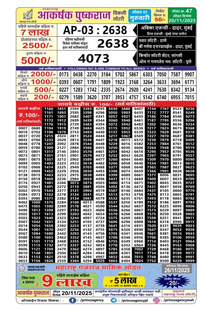 Maharashtra Lottery Result Today Akarshak 4.15PM [20-11-2025]