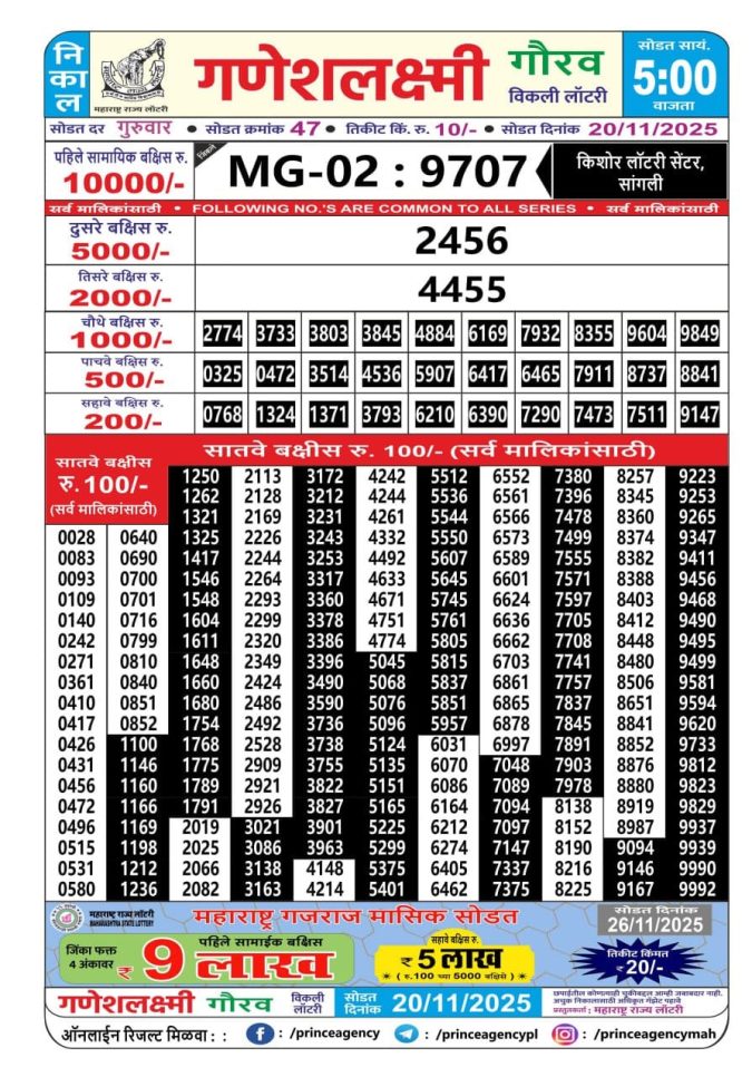 Maharashtra Gajlaxmi Lottery Result Today 4.45PM [20-11-2025]
