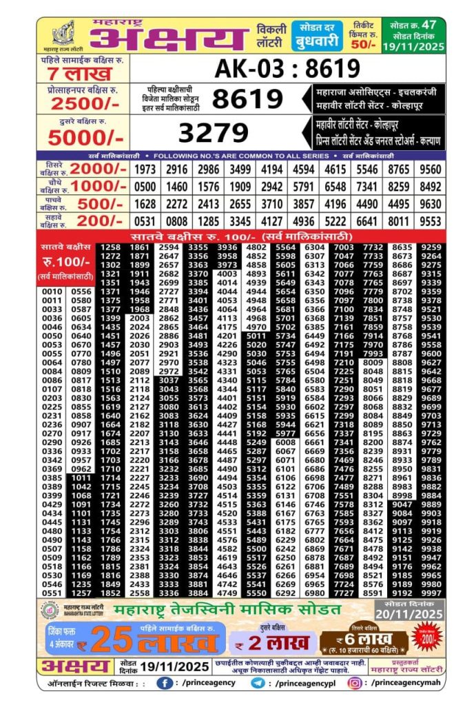 Maharashtra Akshay Lottery Result Today 4.15PM [19-11-2025]